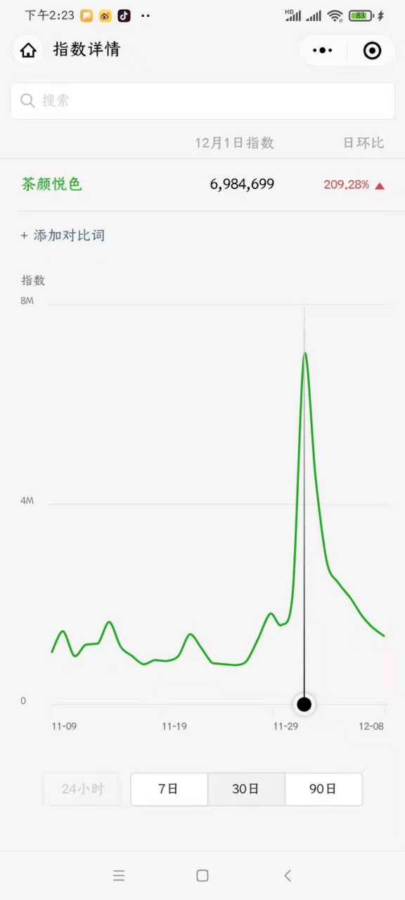 在微信指数中懂懂笔记发现,仅武汉茶颜悦色开业当天,“茶颜悦色”一词的微信搜索指数日环比激增了209.28%,高达698万;而在12月2日,“茶颜悦色”一词的百度资讯指数也飙升至86万,着实很惊人。