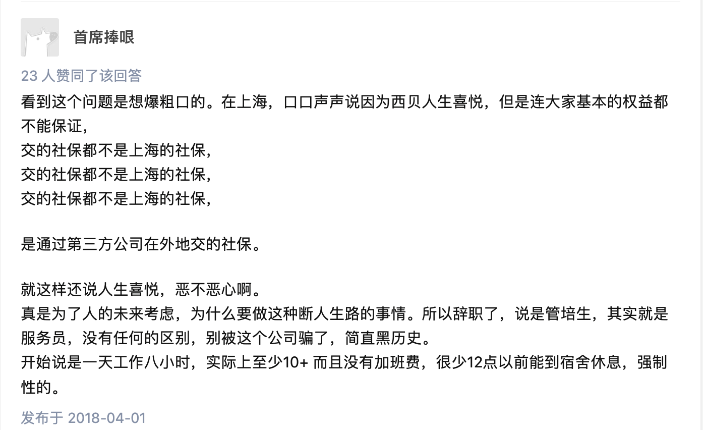 高强度的工作和可能与之对应的金钱回报,真的能带给员工喜悦吗?这本身要靠他们自己感受。对于715工作制中“高高兴兴地去辛苦”,员工们并非没有异议。在知乎上,有一个问题:在西贝莜面村工作是怎样一种体验?不少自称在西贝有过工作经历的人去吐槽,这似乎更像是一个天天高强度工作、没有私人时间的群体的心态。