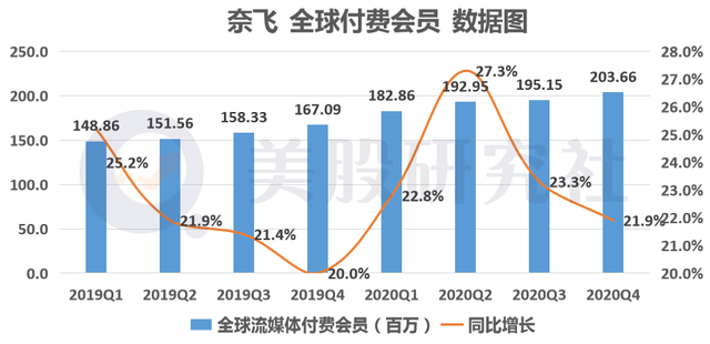 根据奈飞财报显示,2020年第四季度的营收为66.44亿美元,同比增长21.5%,略微超出华尔街分析师此前平均预期的66亿美元。