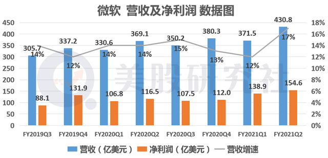 2021财年Q2财报显示,微软的营收为430.8亿美元,同比增长17%,首次突破四百亿大关。该数值也远超出了去年10月公布的指导区间,即395亿美元至404亿美元。