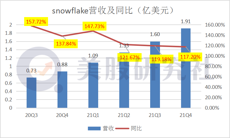 从财报来看,雪花公司第四季度实现营收1.91亿美元,同比增长117%,将在未来期间确认为收入的RPO(剩余履约义务)为13亿美元,同比增长213%。对比前几个季度的数据,可见营收一直保持良好的增长势态。