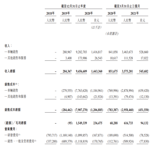 招股书显示,在过去的2018年、2019年、2020年和2021年第一季度,理想汽车的营业收入分别为 0、2.84亿、94.57亿和35.75亿元人民币,相应的净亏损分别为15.32亿、24.39亿、1.52亿和 3.60亿元人民币。