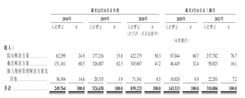 从下图可以看出,在2020年以前,智云健康还是以药店解决方案为主,院内解决方案为辅的模式。来自于药店解决方案收入占比达60%以上;但可以发现的是,来自院内解决方案的收入占比在逐步增大。
