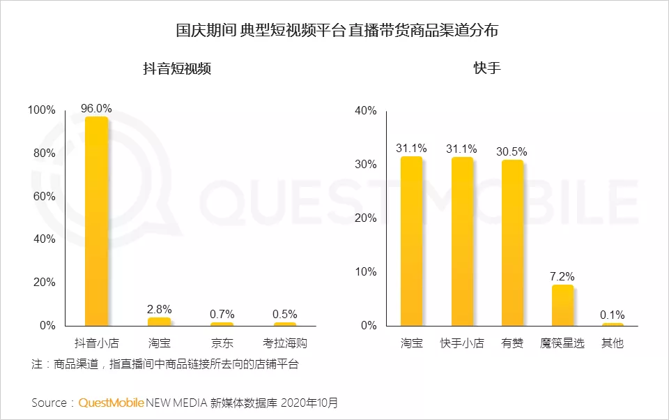 近日,移动互联网数据服务商QuestMobile发布《2020短视频KOL直播电商洞察报告》。报告显示,国庆期间,抖音直播带货商品中,96%来自抖音平台,淘宝占比不到3%,“短视频平台逐步完善电商体系,引导商品在自有渠道中成交”。
