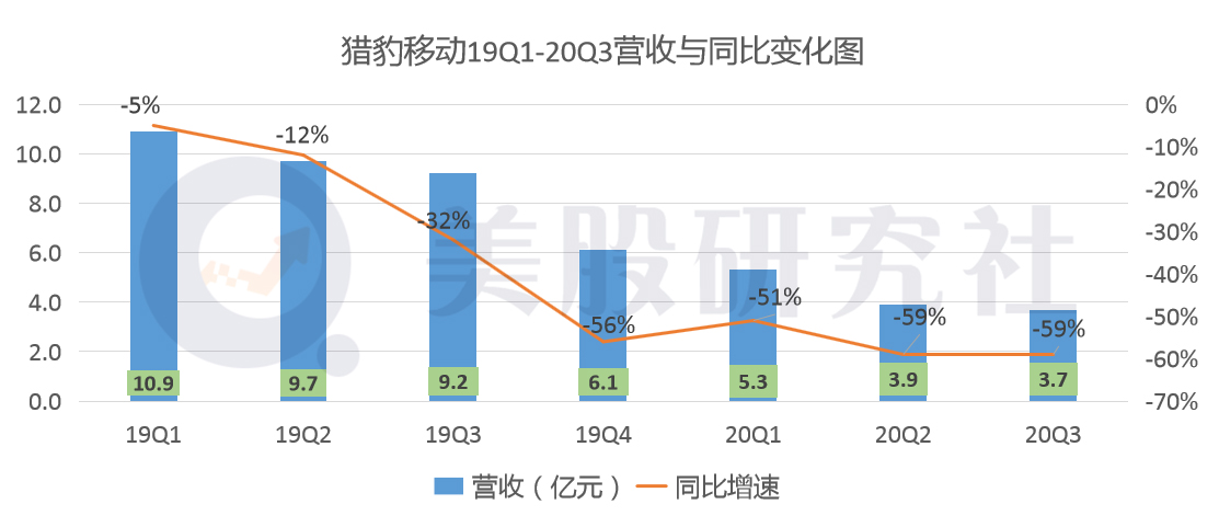 据财报数据显示,猎豹移动三季度的营收数据为3.7亿元,相较于上年同期的9.2亿元,同比下滑59%;与上一财季的3.9亿元相比,环比下滑5%。