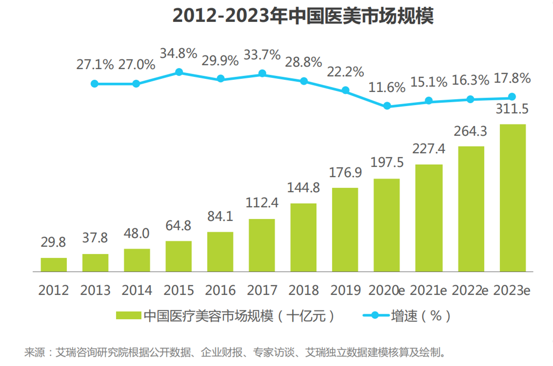 中国的医疗美容市场潜力是巨大的。根据艾瑞统计2019年中国医疗美容市场规模达到1769亿元,增长率放缓至 22.2%;2019年中国医美用户1367.2万人,预测19年至23年CAGR为16.8%,2023年医美用户将达2548.3万人。