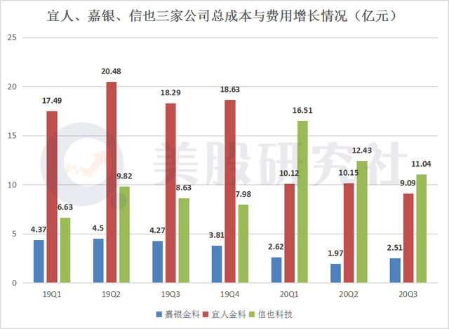 与营收情况截然相反的是,宜人和嘉银的总费用与成本支出自今年以来有所减少,而信也科技在总费用与成本上的支出不降反升。